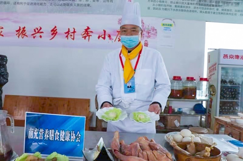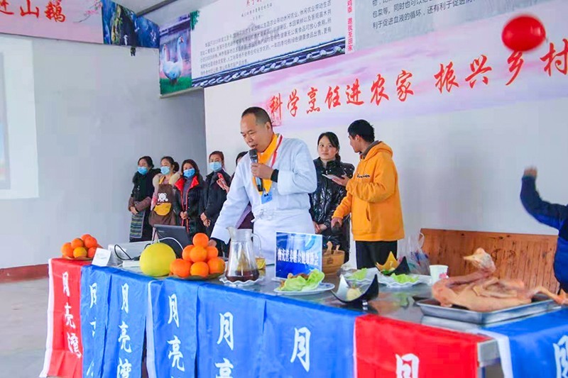 12月26日,南充市营养膳食健康协会的四川省农民工技能大赛全能铜牌获得者、中式烹调技师李旭、南充职业技术学院农业科学系志愿者候发、南充启翔职业技术培训学校马老师等来到西充县古楼镇月亮湾农家山庄,将当地农庄的赶山鹅,用科学的烹饪方法做成10多道美味鹅菜品,用技术支持乡村振兴,助力乡亲奔小康。