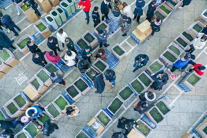 定价、上秤、算账、付款,茶农卢思敏还未坐定,背篓中的鲜叶就被抢购一空。“从大年初三开始,就有来自江浙一带的茶商上门购茶。”各市场中的售位点前围满了前来咨询的茶商,工作人员提着开水在各区域来回奔走。“今年生意较好,新采制的茶叶基本都能及时销完。”