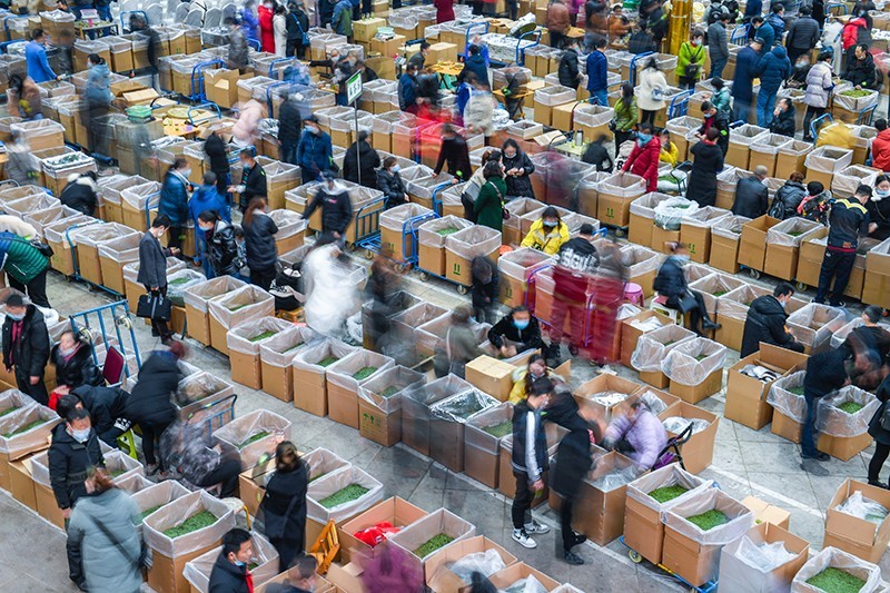测体温、查验健康码……还未进入市场,一股淡淡的茶香便扑鼻而来。蛟龙出海、白龙过江……舞台上,熟悉的茶艺“龙行十八式”在热闹的市场上演,有人驻足观看鼓掌,但更多操着外地口音的茶商还在“茶海”中找寻合适的优质茶叶。